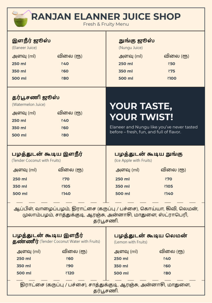 A fresh, user-friendly menu design that reflects the brand’s natural, customizable spirit—with touches of Goundamani–Senthil humor for local flair.